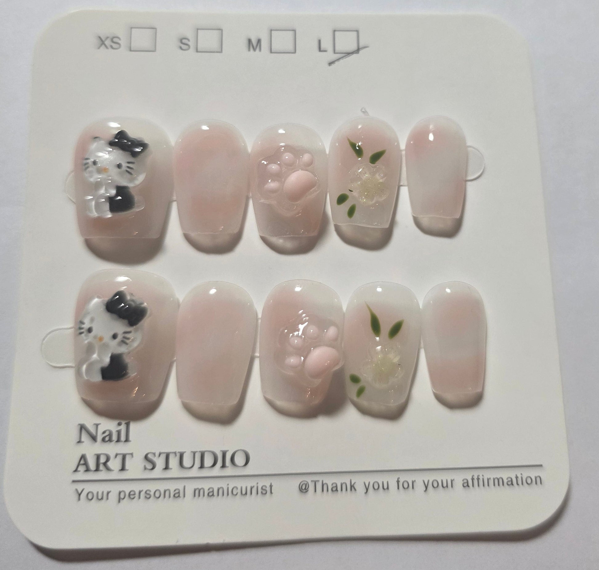 Experience refined charm with these handmade, large-sized white press-on nails featuring a subtle Hello Kitty motif. Designed with a rounded shape for a graceful fit, they are reusable and simple to apply, offering a polished and playful touch to your look without compromising elegance.